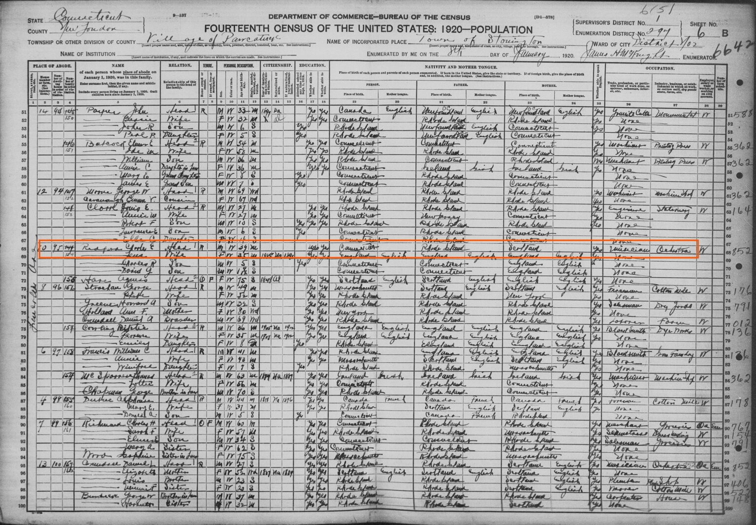 Charles E. Redford in der US-Volkszählung von 1920, mit „Musiker“ als Beruf und „Orchester“ als Branche angegeben (zum Vergrößern klicken). Quelle: MyHeritage