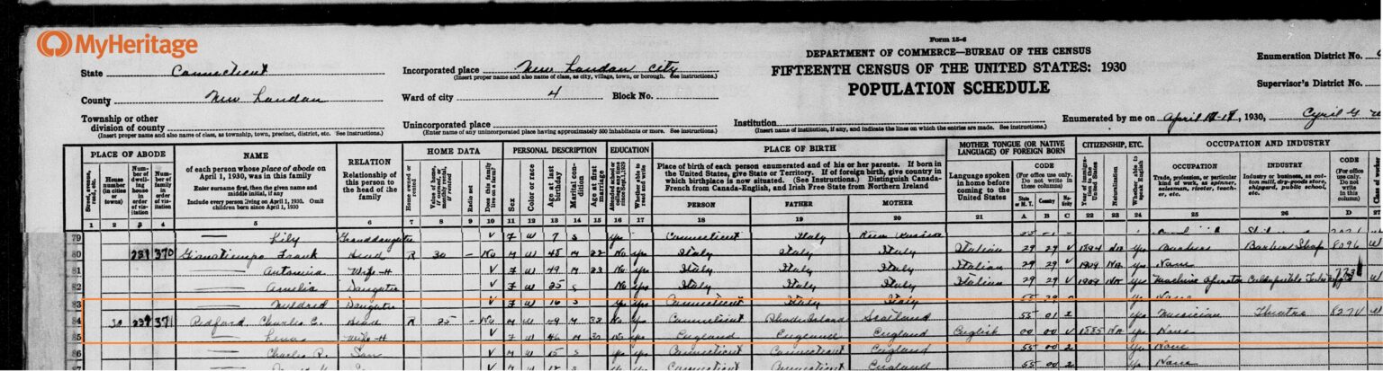 Charles E. Redford erscheint erneut in der US-Volkszählung von 1930 als Musiker – diesmal mit „Theater“ als Branche angegeben (zum Vergrößern klicken). Quelle: MyHeritage