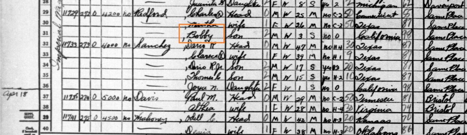 Robert Redford in der US-Volkszählung von 1940 zusammen mit seiner Familie im Alter von 3 Jahren, eingetragen als „Bobby“ (zum Vergrößern klicken). Quelle: MyHeritage