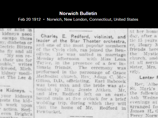 Die Hochzeit von Charles E. Redford, beschrieben im Norwich Bulletin, veröffentlicht am 12. Februar 1912. Quelle: OldNews.com