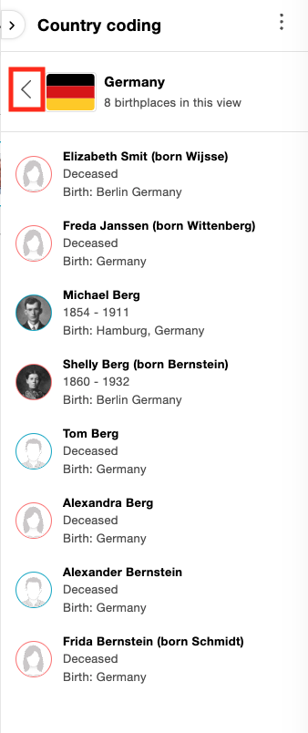 Wenn Herkunftsflaggen aktiviert sind, öffnet sich rechts das Panel für Herkunftsflaggen. Das Panel listet die Geburtsländer für Personen in der aktuellen Ansicht auf. Es zeigt an, wie viele Personen im jeweiligen Land geboren wurden. Wenn Sie zwischen den Ansichten wechseln, bleibt das Panel geöffnet. Um das Panel zu minimieren, klicken Sie auf den Pfeil oben.