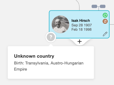 In einigen Fällen können Herkunftsflaggen einen Ort keinem heutigen Land zuordnen. Das kann passieren, wenn der Geburtsort zu allgemein ist (z. B. der Name eines Krankenhauses). Es passiert auch, wenn der Ort ein historisches Land ist, das nicht mehr existiert (z. B. UdSSR). Dann erscheint ein Fragezeichen-Symbol auf dem Profil. Wir empfehlen, die Ortsangaben in solchen Fällen unverändert zu lassen.