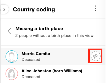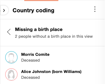 Am unteren Rand des Panels für Herkunftsflaggen sehen Sie, bei wie vielen Personen in dieser Ansicht ein Geburtsort fehlt. Klicken Sie darauf, um diese Personen anzuzeigen.