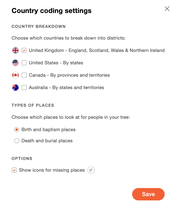 In den Einstellungen legen Sie fest: Welche Länder unterteilt werden sollen, welche Lebensereignisse die Flaggen bestimmen (Geburt oder Tod) und ob Symbole für fehlende Orte angezeigt werden sollen.