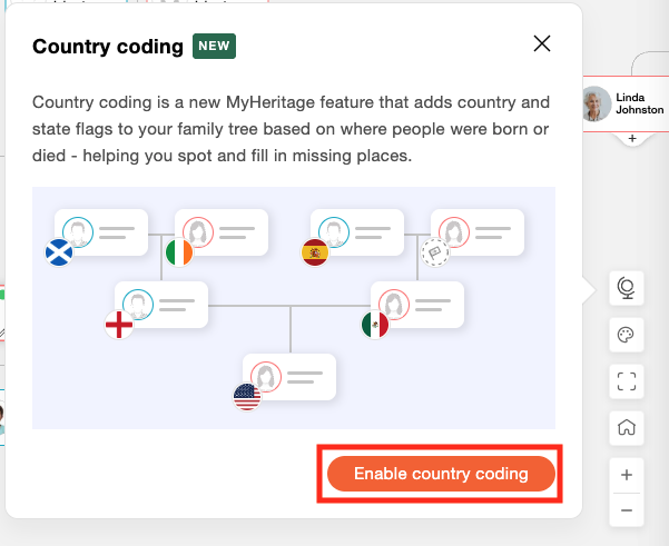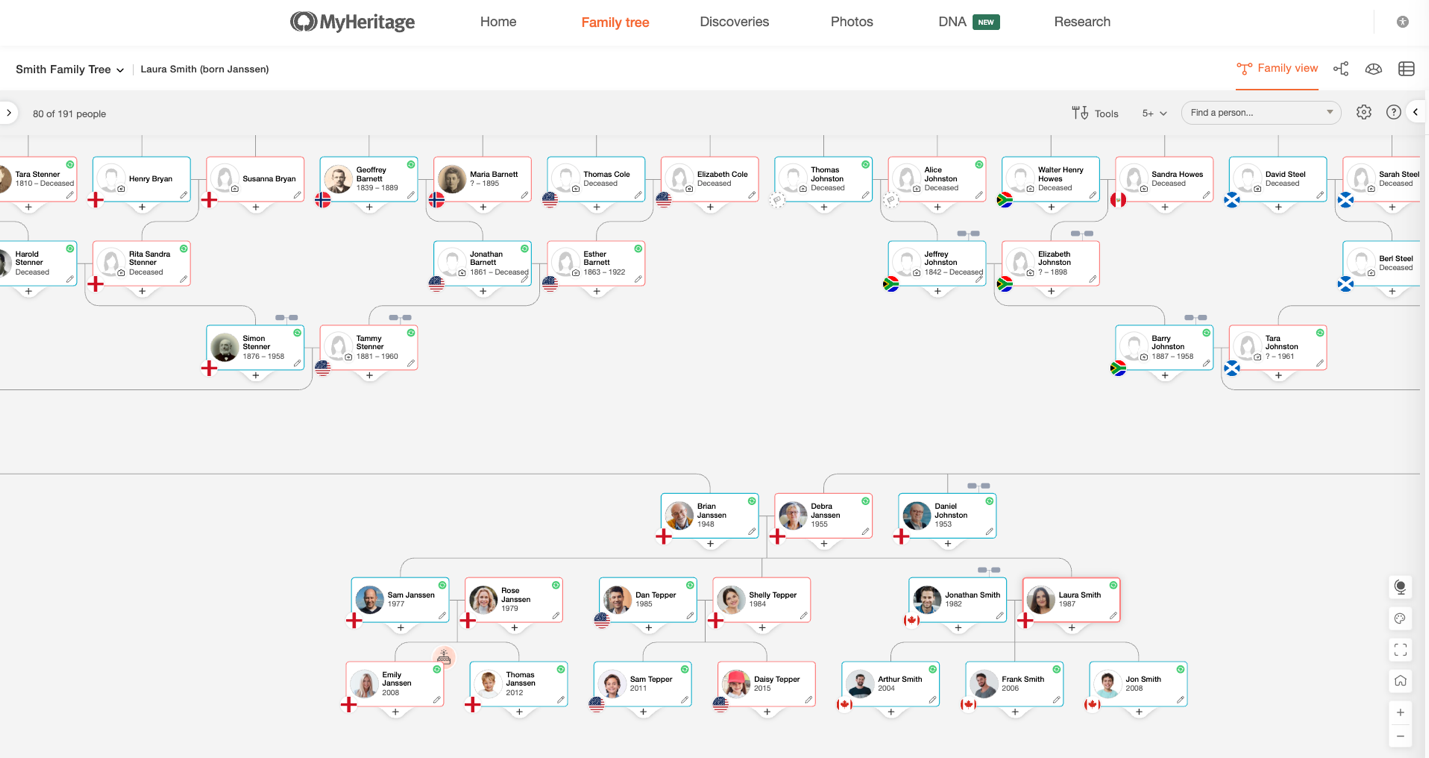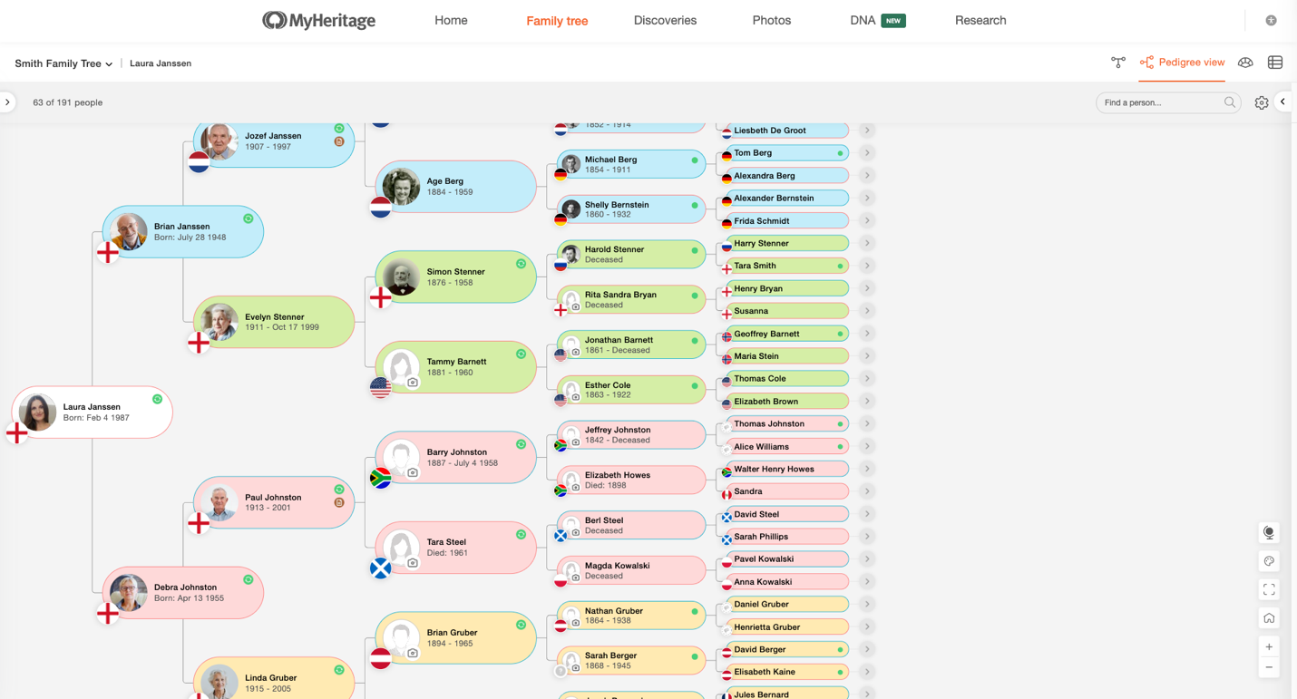 Ein Stammbaum erzählt oft zahlreiche Geschichten. Es ist jedoch nicht immer einfach, die geografische Herkunft auf einen Blick zu erkennen. Um Ihnen zu helfen, Ihre Familiengeschichte besser zu visualisieren, haben wir Herkunftsflaggen für Stammbäume hinzugefügt. Diese kostenlose neue Funktion zeigt Länderflaggen für Personen in Ihrem Stammbaum an. Die Flaggen basieren auf wichtigen Lebensereignissen und verwandeln Ihren Stammbaum in eine visuelle Karte Ihrer Herkunft.