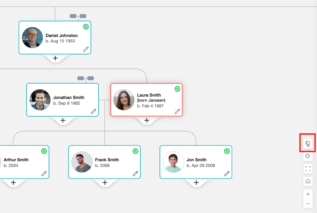 Eine neue Schaltfläche mit einem Globus-Symbol wird unten rechts im Stammbaum angezeigt. Klicken Sie darauf, um Herkunftsflaggen zu aktivieren. Dadurch öffnet sich auch das Panel für Herkunftsflaggen. Das Globus-Symbol wird in der Familienansicht, Ahnentafelansicht und Fächer-Ansicht angezeigt.