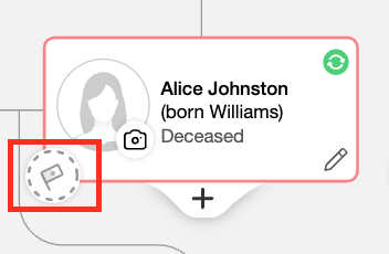 Personen ohne Geburts- oder Taufort haben ein Flaggen-Symbol mit einem gestrichelten Kreis. Um einen Geburtsort für diese Person hinzuzufügen, klicken Sie auf das Flaggen-Symbol. Geben Sie die Details im Panel „Profil bearbeiten“ ein.
