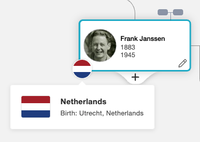 Nach der Aktivierung werden automatisch Flaggen hinzugefügt. Diese erscheinen unten links auf der Profilkarte bei allen Personen mit Geburts- oder Taufort. Bewegen Sie den Mauszeiger über eine Flagge, um ein Hinweisfenster zu sehen. Dort steht der vollständige Geburtsort. Das hilft, wenn Sie eine Flagge nicht sofort erkennen.